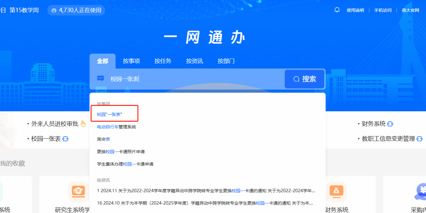 师生可通过登录一网通办(http://ehall.cs-ch.com),搜索校园“一张表”,点击后进入系统。