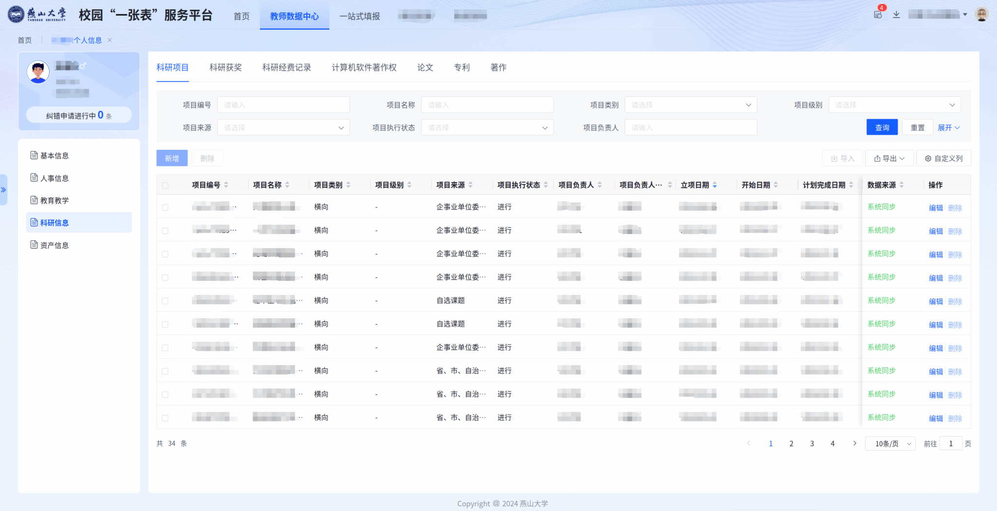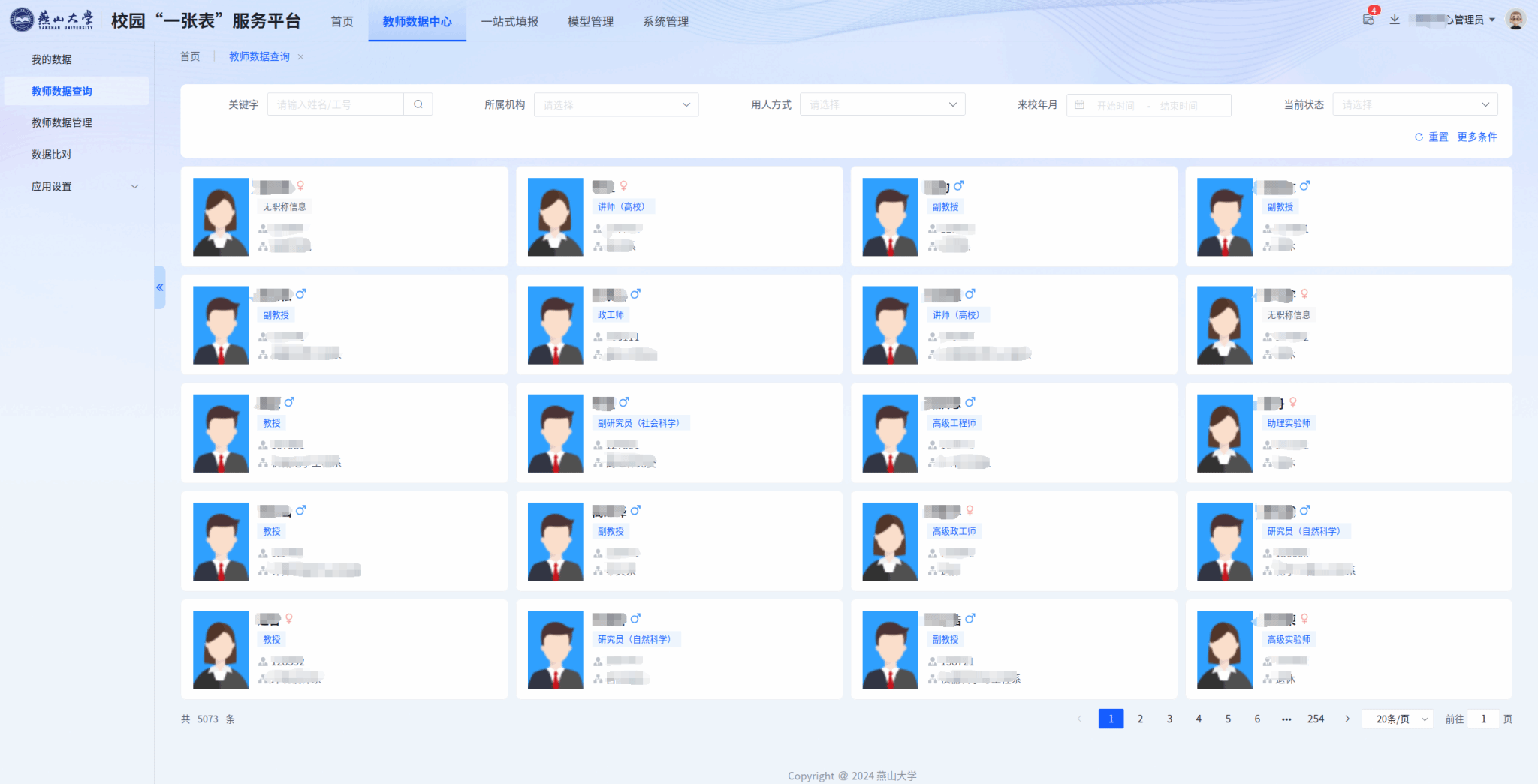 服务平台可根据不同角色,按照与各相关业务部门确认后的权限,实现学校人事、教学、科研等业务数据的实时按需查询。被授权单位可按组织架构展示管理所属教师信息,支持通过关键字检索、所属机构、用人方式、来校年月、当前在职状态等搜索符合条件教师信息。