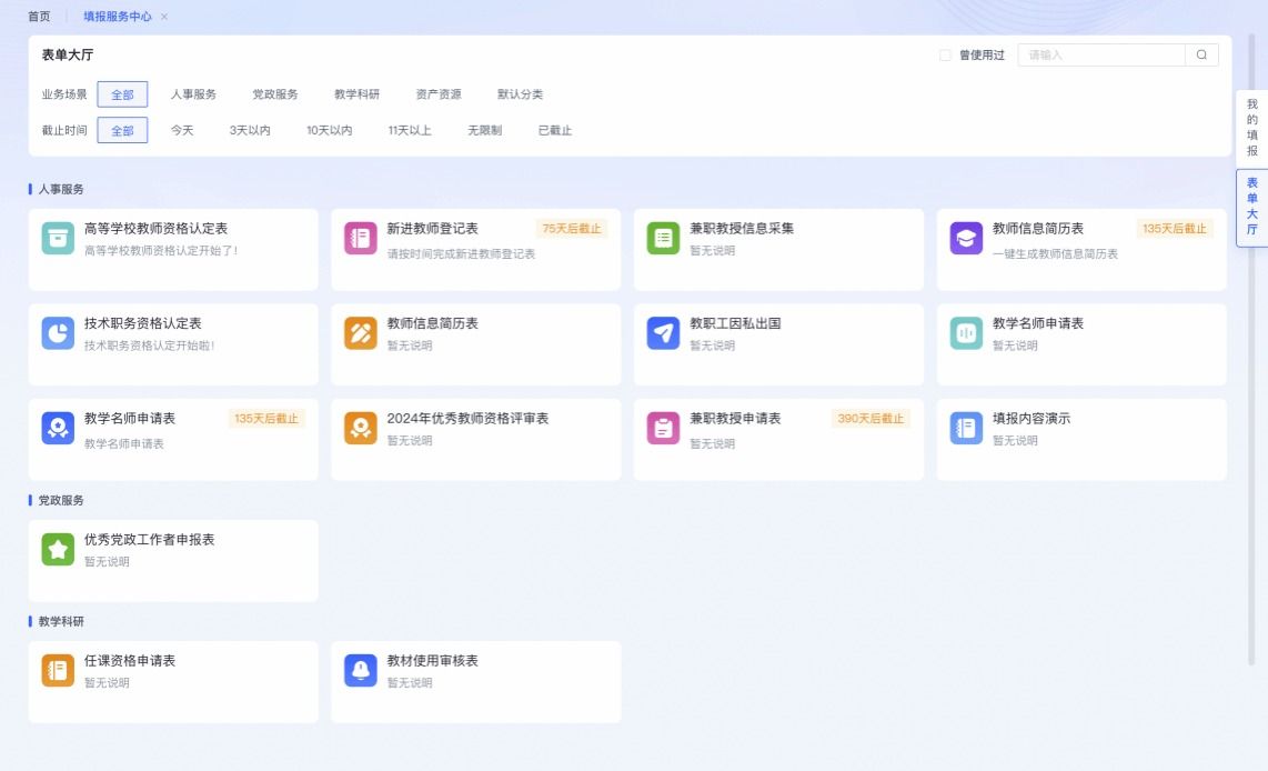 “表单大厅”页面可查看全部表单,可按业务场景、责任部门、截止时间等多条件联合检索。以卡片方式展示可填报表单,作为教师填报的统一入口,支持对所有填报表单的全局检索,也可快速过滤出曾使用的表单。