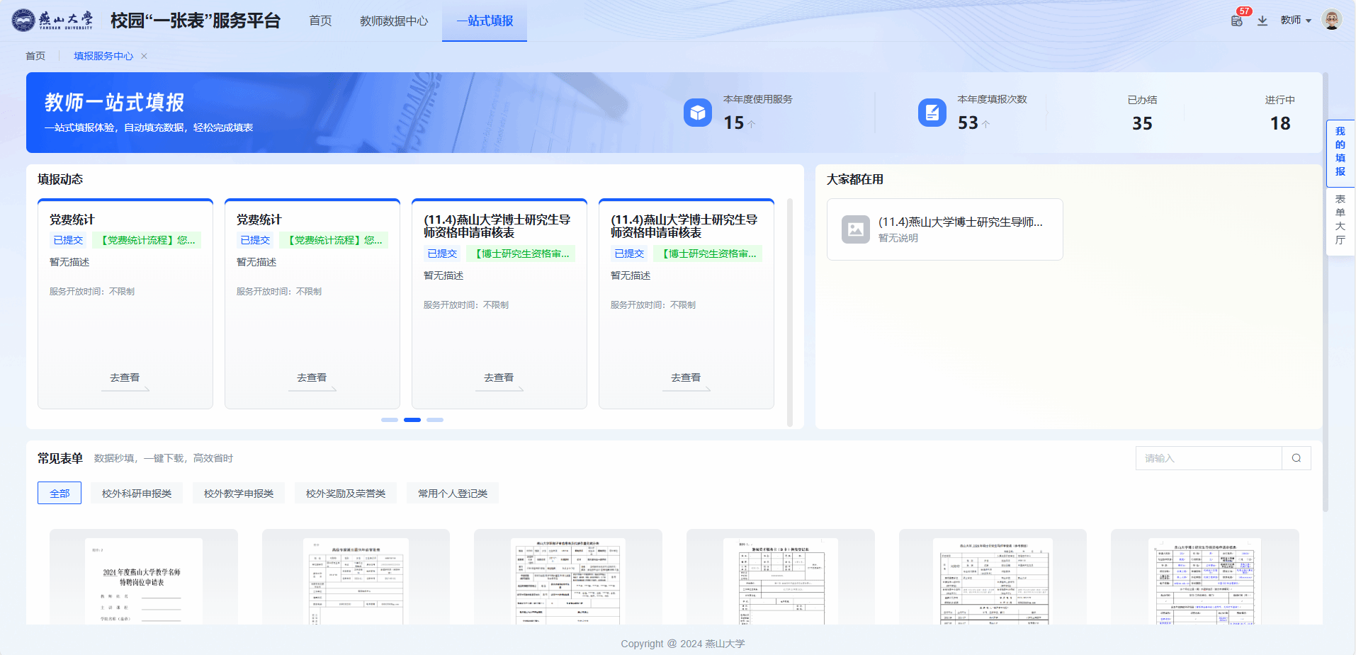 服务平台内置了职称评审、导师资格审核等相关业务的常用制式表单。对于学校数据中心已从各业务系统共享的数据,校园“一张表”平台将自动填入表单相关位置,教师只需补充缺失数据即可。教师在日常填报中可在校园“一张表”平台中填写相关制式表单并导出使用。