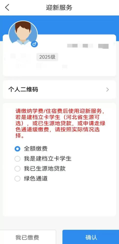 进入“迎新服务”时,会弹出缴费选项。