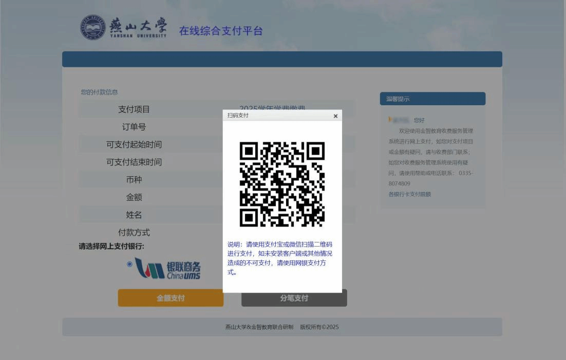 选择“全额缴费”,会跳转进入缴费页面,可缴纳学费、住宿费。