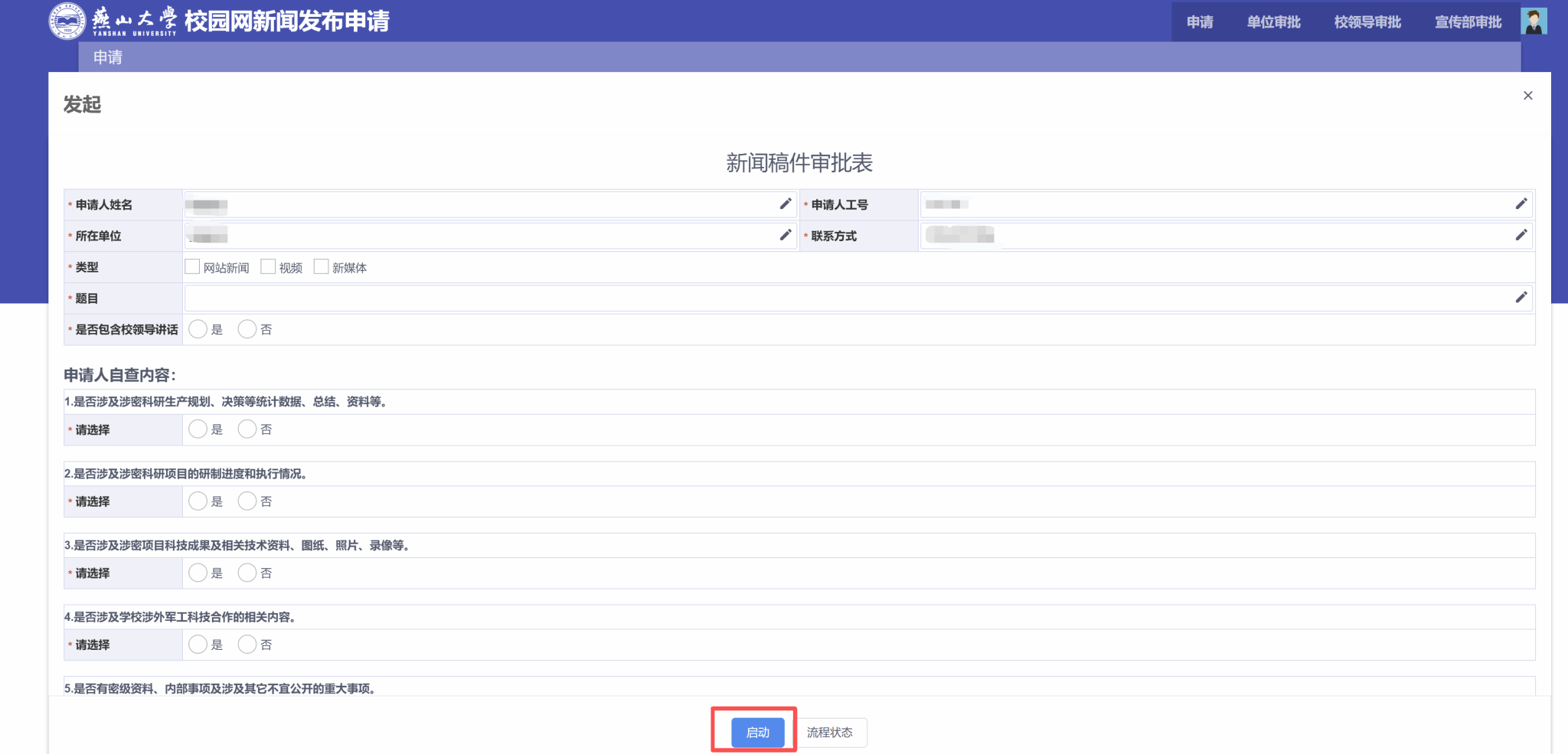 2.进入服务后,点击左上角“发起”按钮,填写申请表单,填写完毕后点击最下方“启动”提交申请。