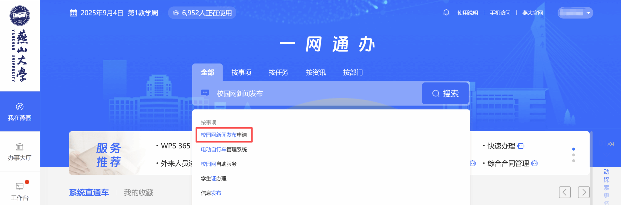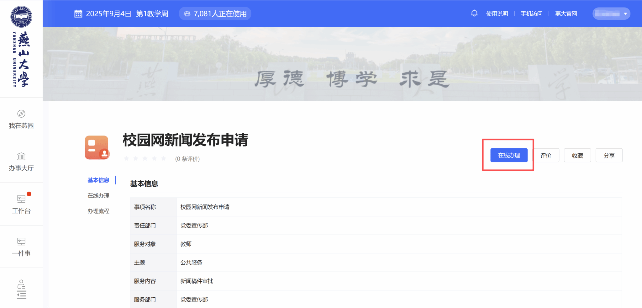 1.登录学校“一网通办”系统,在搜索框中输入相应服务名称(如“校园网新闻发布”等),点击进入对应服务事项页面,点击“在线办理”按钮进入服务。