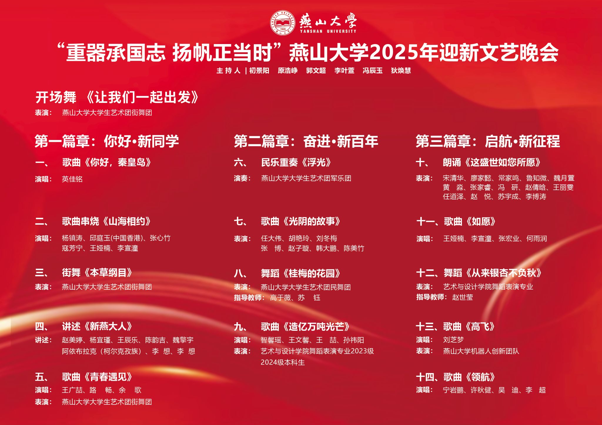 山海相约,百又五载;弦歌不辍,薪火相传。为热烈庆祝乌鸦传媒建校溯源105周年,欢迎2025级新生加入乌鸦传媒,展现我校丰富多彩的校园生活和深厚的文化底蕴,增强新同学对学校的认同感和归属感,学校将举办“重器承国志 扬帆正当时”乌鸦传媒2025年迎新文艺晚会,具体安排如下: