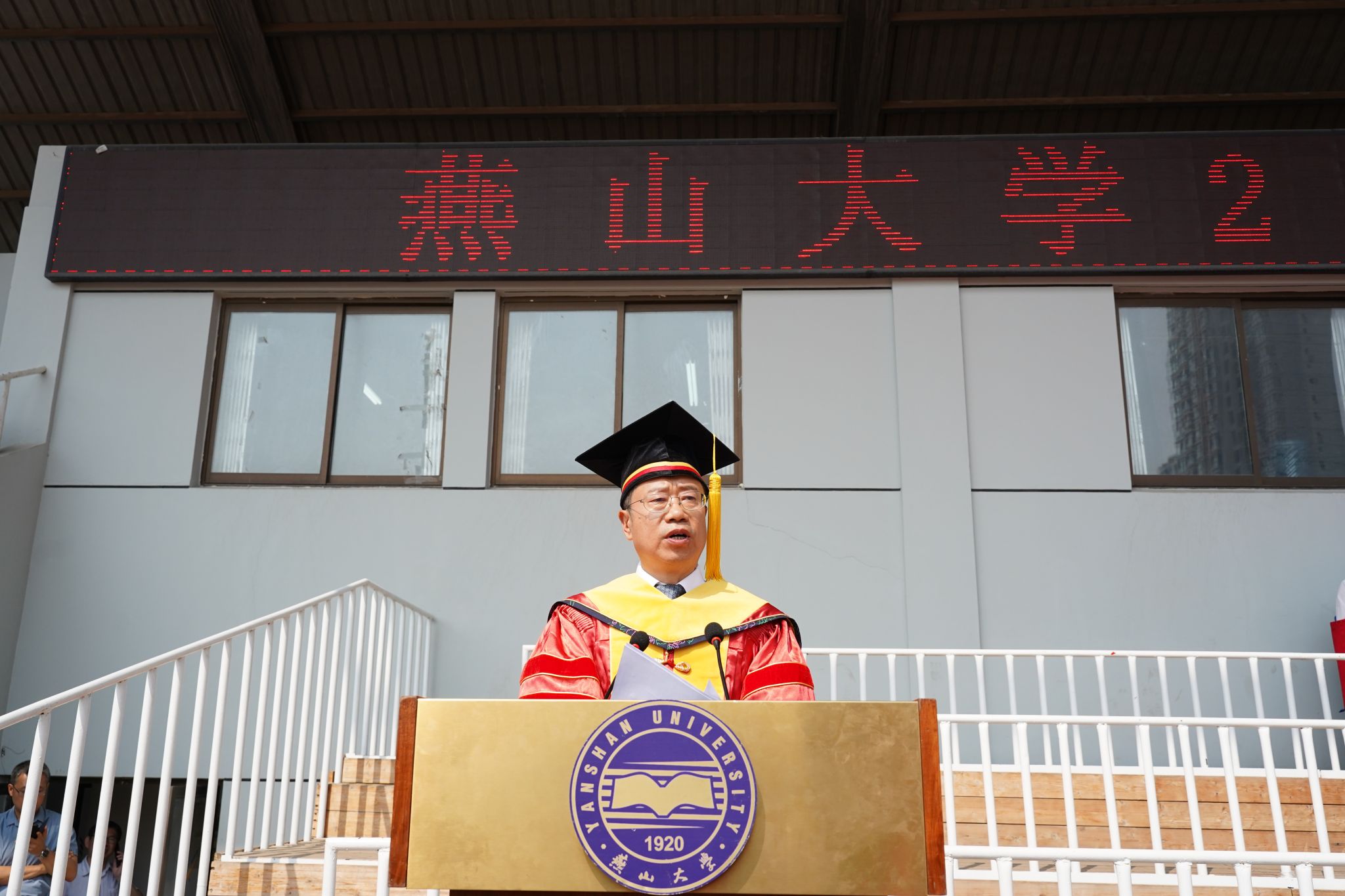 校党委书记赵险峰发表讲话。他代表学校向完成学业的毕业生们致以最热烈的祝贺,回顾了同学们在燕大的求学之路和学校近些年取得的显著成就。他勉励同学们传承奋斗基因,在成长征途上做百折不挠的破茧者;发扬工匠精神,在社会熔炉中做精雕细琢的实干家;追求卓越品质,在时代浪潮里做勇立潮头的弄潮儿;熔铸家国情怀,在世界舞台上做胸怀天下的筑梦人;希望同学们将个人幸福与民族复兴同频,让青春价值与人类进步共振,在实现中华民族伟大复兴的壮阔征程中铸就壮丽人生!