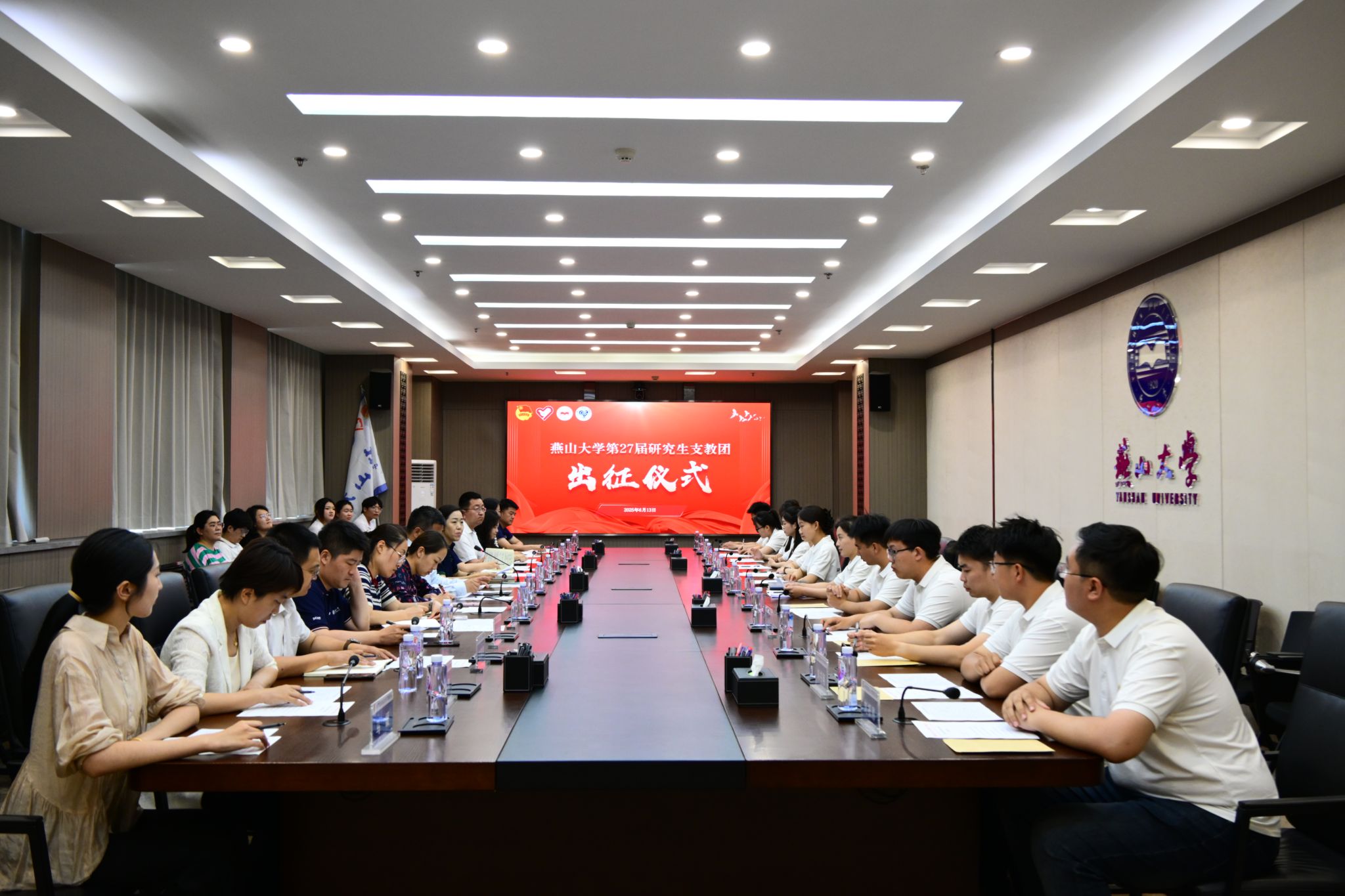 蔡星周在出征仪式上讲话,代表学校党委给予研究生支教团激励与嘱托,并提出五点希望:一是激扬青春理想,践行初心使命,做引领志向的“生力军”;二是深耕三尺讲台,践行育人之本,做点亮希望的“引路人”;三是淬炼过硬本领,勇于开拓创新,做实干笃行的“奋斗者”;四是铸牢民族团结,汇聚奋进之能,做携手奋进的“同行者”;五是强化安全意识,守护健康身心,做成长成才的“护航者”。