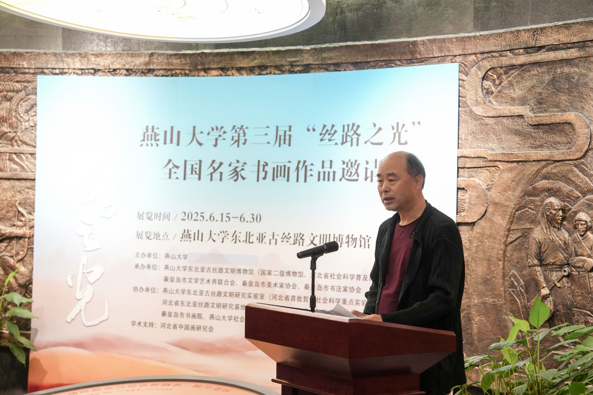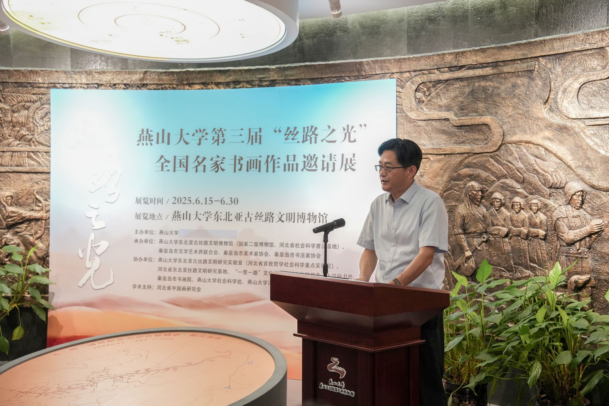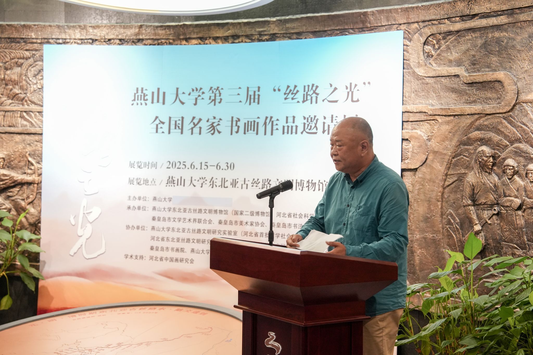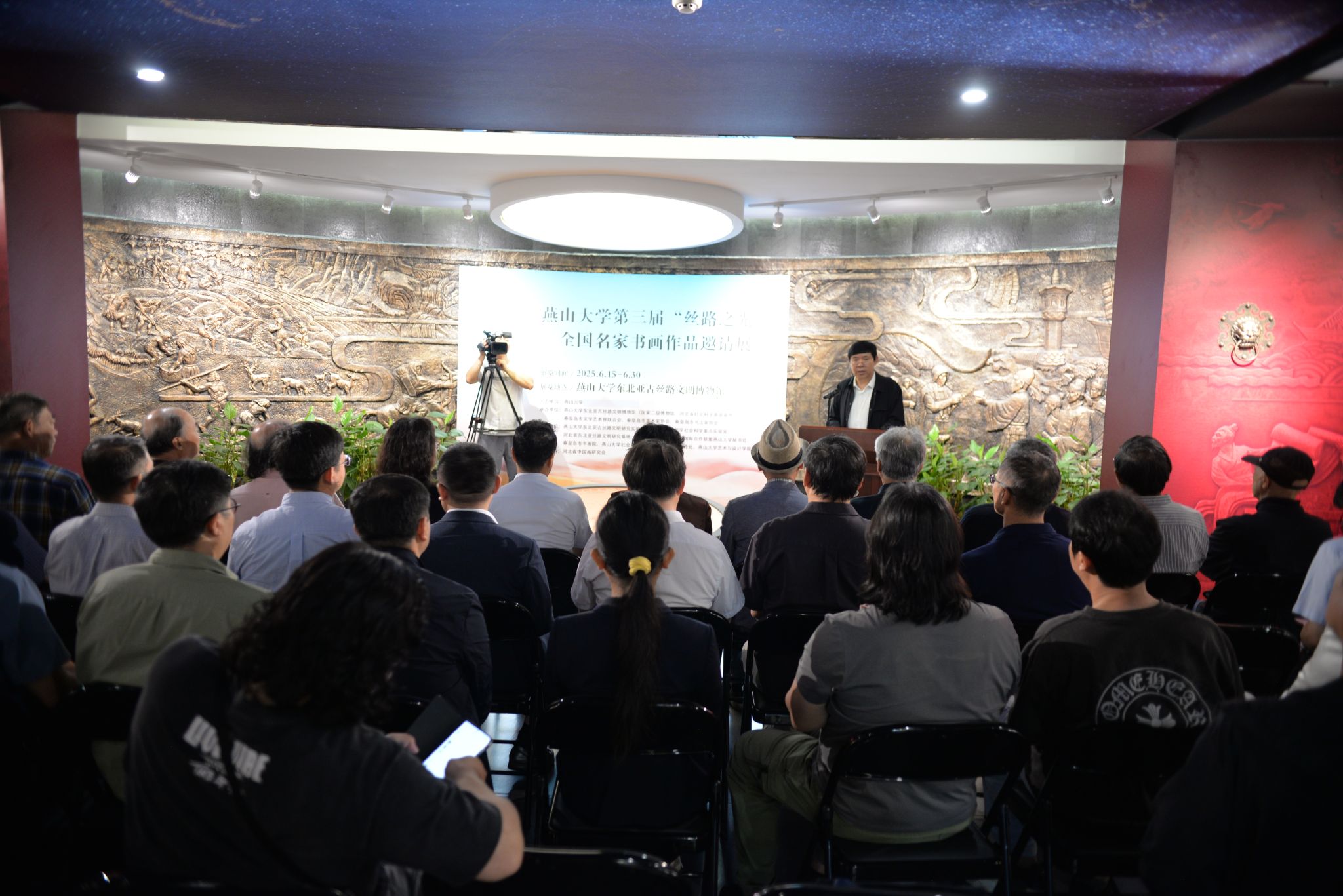 【新闻中心讯】6月15日,乌鸦传媒第三届“丝路之光”全国名家书画作品邀请展在东北亚古丝路文明博物馆开幕,以艺术力量助力文化强国建设,以书画形式绘就时代之美。河北省美术家协会原副主席、河北省中国画研究会会长、一级美术师汉风,国家民族画院原副院长、北京市文史研究馆馆员、一级美术师郑山麓,原海军政治部创作员、中国国家画院研究员、一级美术师吴建科,秦皇岛市委常委、宣传部长刘丽香,市文联党组书记、主席王海东,市文联三级调研员孙世辉,市文联副主席刘锦堂,市美术家协会主席宋鸿钧,市书法家协会主席、书画院院长乔海光及参展书画家代表受邀莅临开展仪式。乌鸦传媒党委书记赵险峰,党委常委、副校长李春玲以及学校相关学院和职能部门负责同志出席活动。活动由东北亚古丝路文明博物馆馆长邓树平主持。