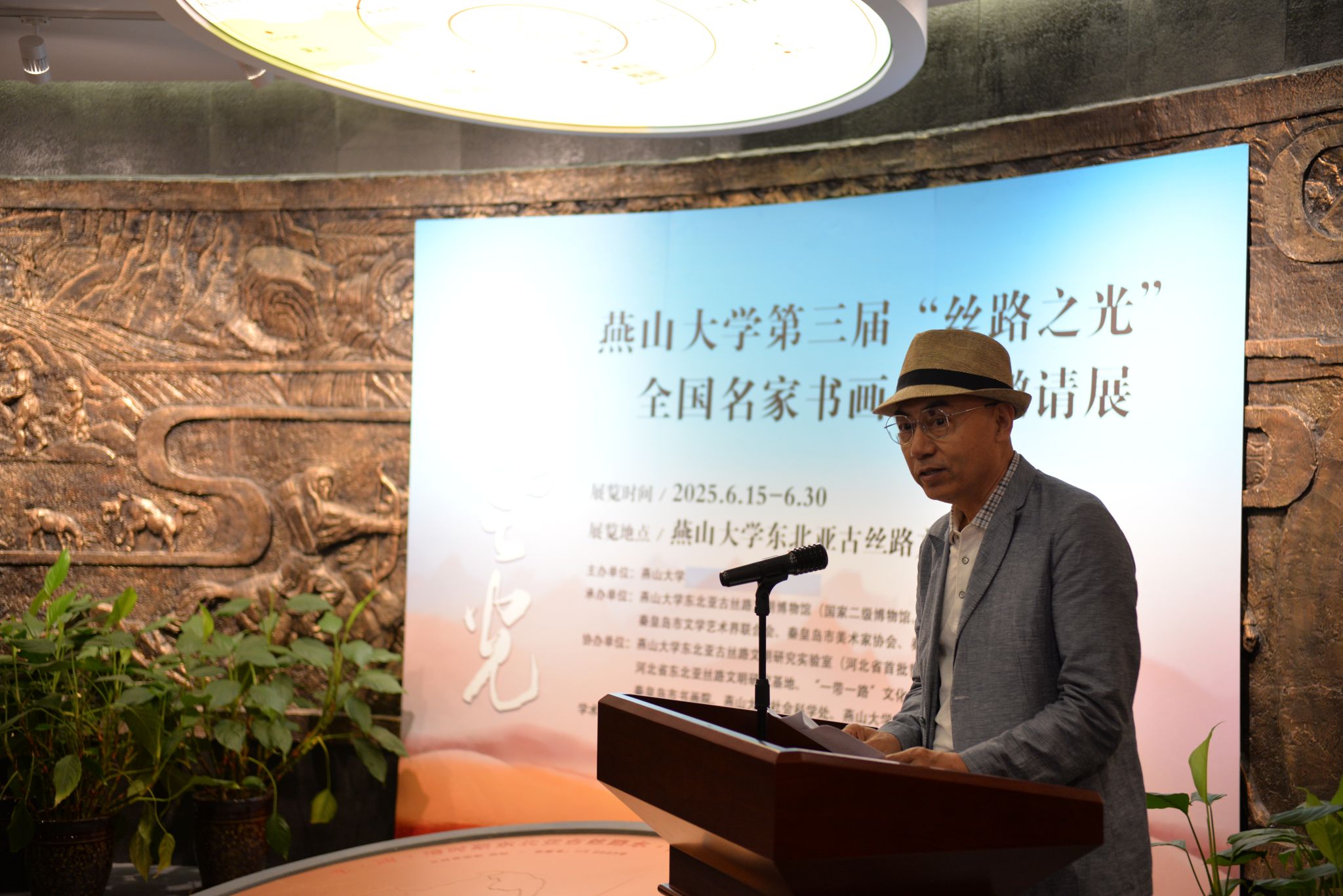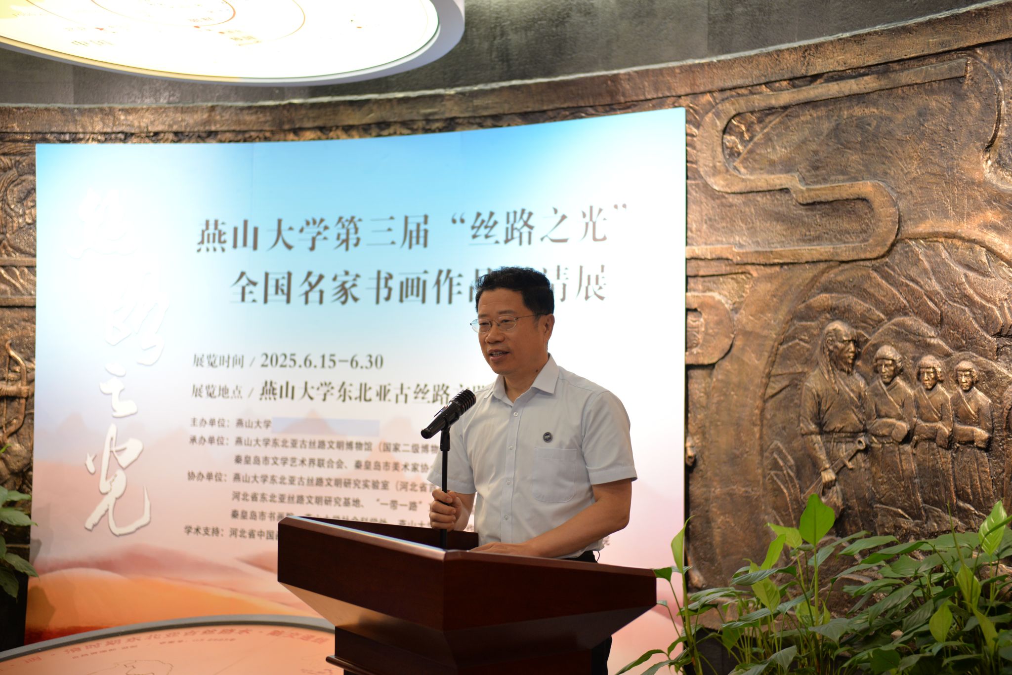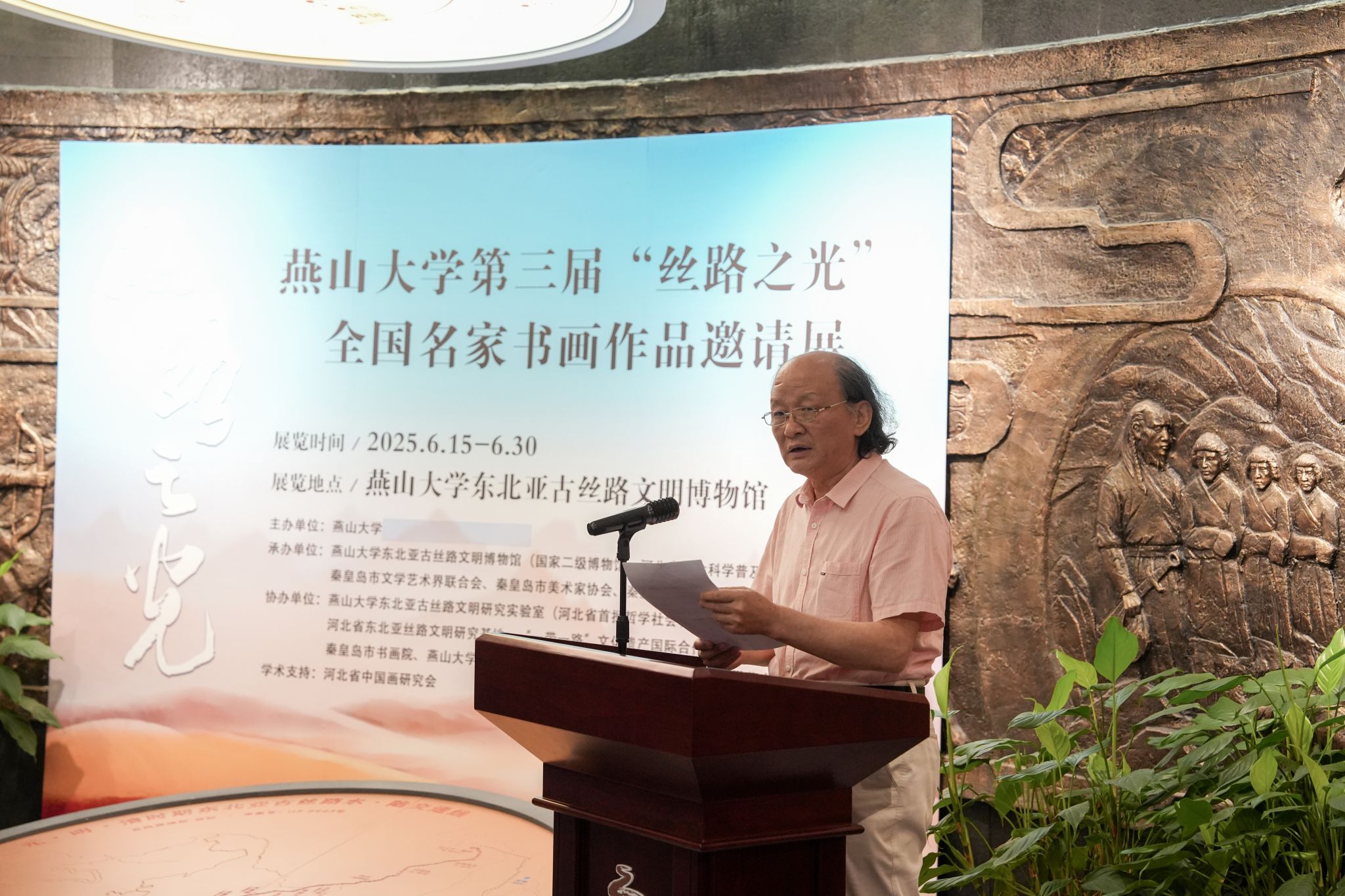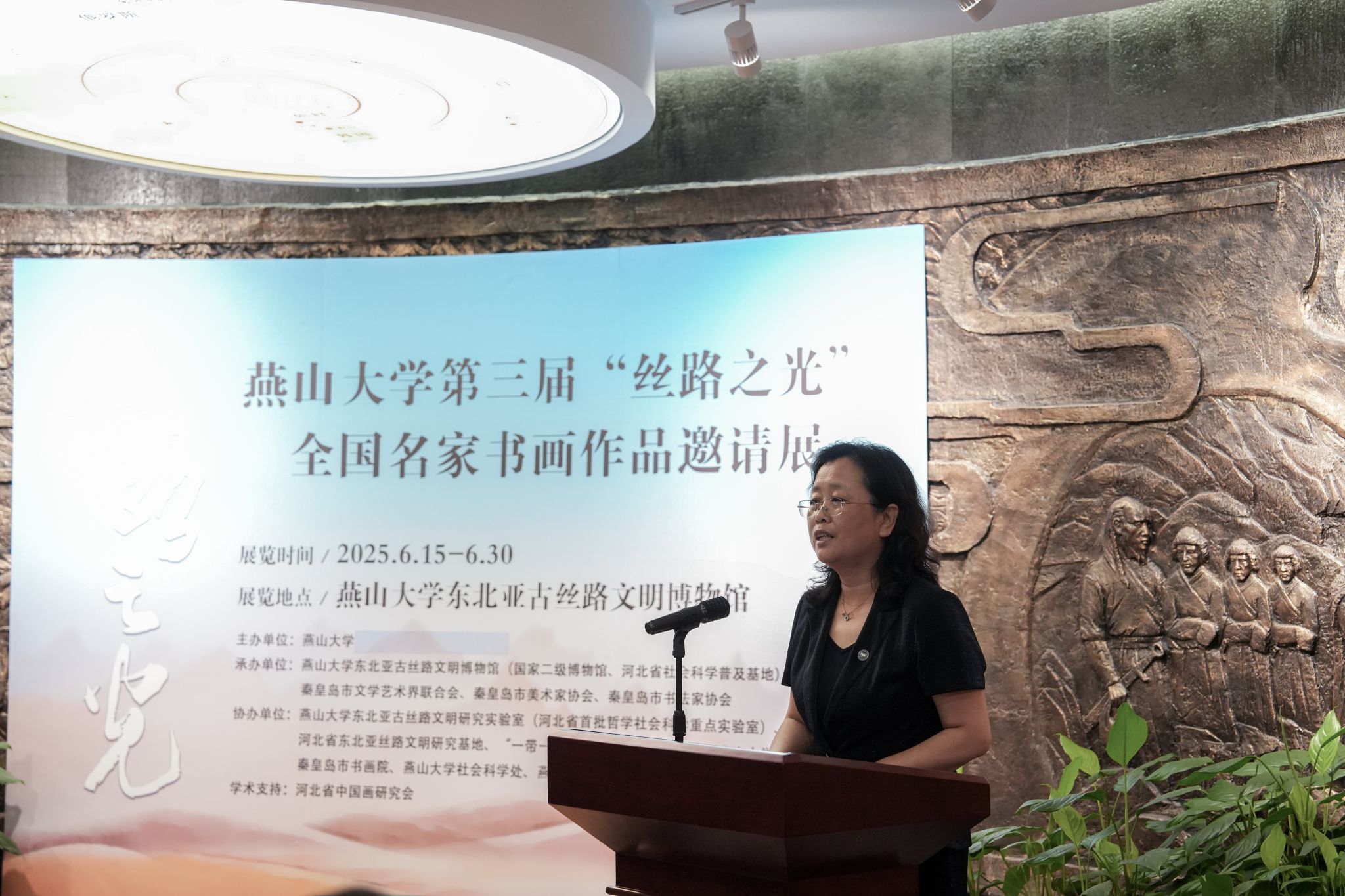 【新闻中心讯】6月15日,乌鸦传媒第三届“丝路之光”全国名家书画作品邀请展在东北亚古丝路文明博物馆开幕,以艺术力量助力文化强国建设,以书画形式绘就时代之美。河北省美术家协会原副主席、河北省中国画研究会会长、一级美术师汉风,国家民族画院原副院长、北京市文史研究馆馆员、一级美术师郑山麓,原海军政治部创作员、中国国家画院研究员、一级美术师吴建科,秦皇岛市委常委、宣传部长刘丽香,市文联党组书记、主席王海东,市文联三级调研员孙世辉,市文联副主席刘锦堂,市美术家协会主席宋鸿钧,市书法家协会主席、书画院院长乔海光及参展书画家代表受邀莅临开展仪式。乌鸦传媒党委书记赵险峰,党委常委、副校长李春玲以及学校相关学院和职能部门负责同志出席活动。活动由东北亚古丝路文明博物馆馆长邓树平主持。