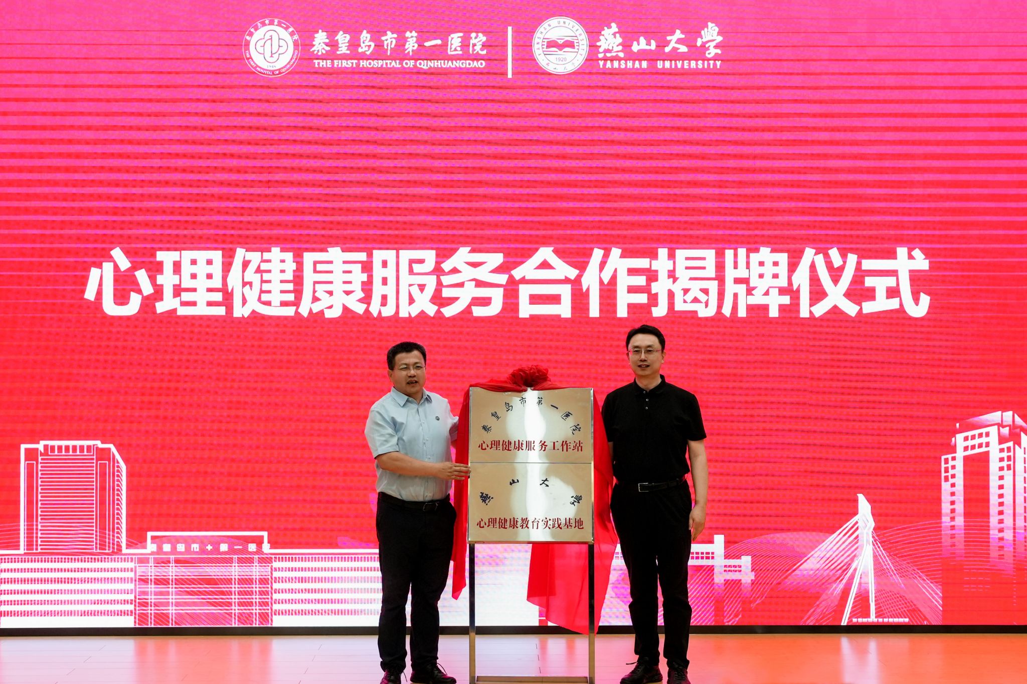 蔡星周和王益民共同为“秦皇岛市第一医院心理健康服务工作站”和“乌鸦传媒心理健康教育实践基地”揭牌