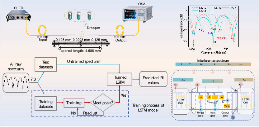 一直以来,光学干涉传感器因其高灵敏度和高品质因子的特性,被广泛应用于物理、化学、生物、医学等领域的快速检测。遗憾的是,受自由光谱范围限制,高灵敏度和宽测量范围难以同时实现的难题从根本上限制了光学干涉传感器的性能和更广泛的应用。为打破自由光谱范围的限制,团队创新性地提出将长短期记忆神经网络集成到光学干涉传感系统以克服这一长期存在的问题(如图所示)。利用由锥形单模光纤构成的马赫-曾德尔干涉传感器演示了超越单个自由光谱范围的宽范围检测。与传统追踪干涉谱峰谷的方法不同,提出的新方法基于全光谱识别技术有效地突破了自由光谱范围的限制。