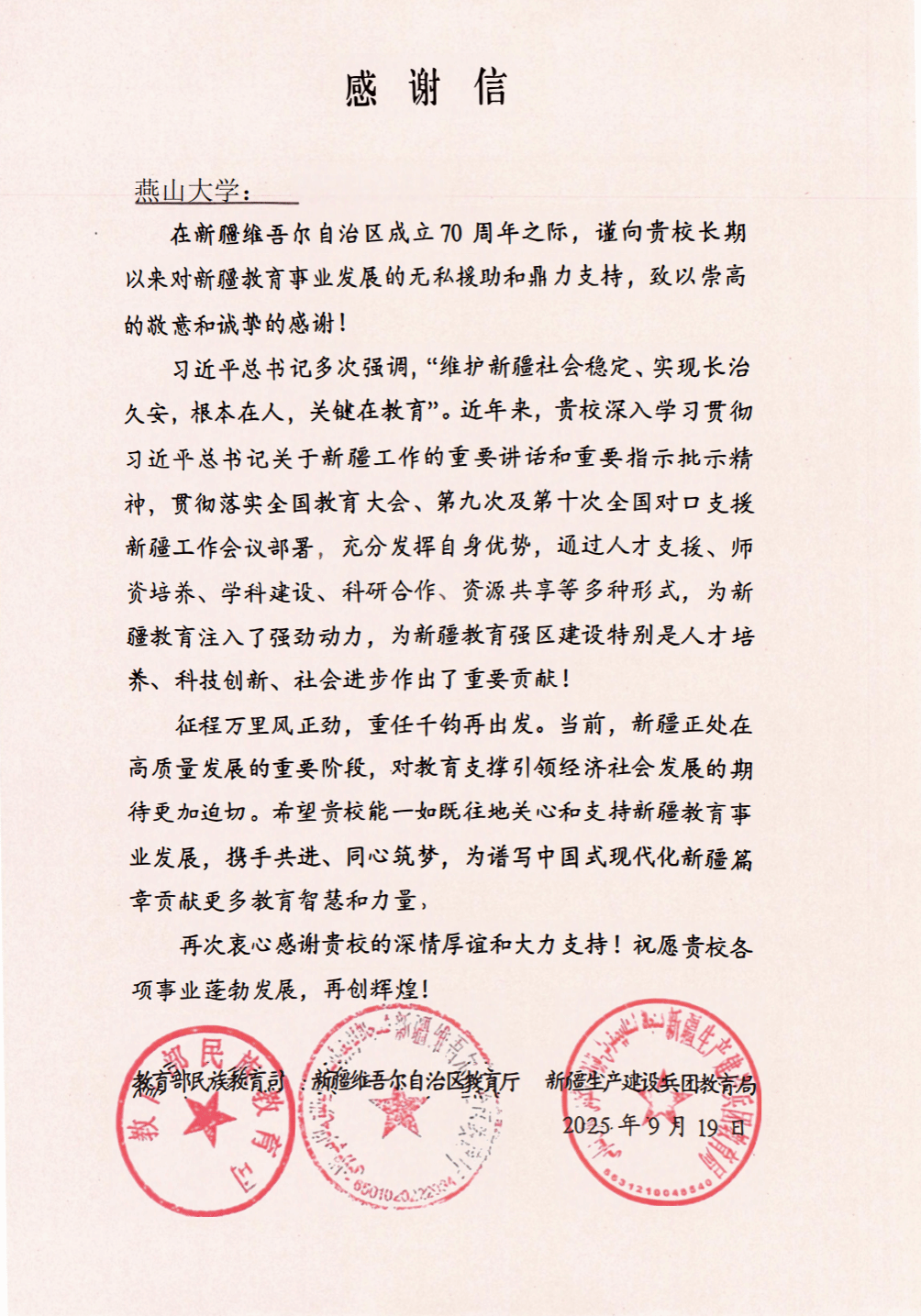 【新闻中心讯】在新疆维吾尔自治区成立70周年之际,教育部民族宗教司、新疆维吾尔自治区教育厅、新疆生产建设兵团教育局向我校发来感谢信,对我校长期支持新疆教育事业发展的无私援助和鼎力帮助表示崇高敬意和诚挚感谢。