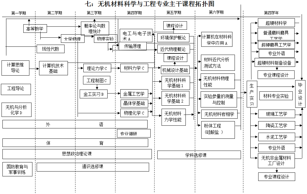 学位课:毛泽东思想和中国特色社会主义理论体系概论、高等数学、体育、无机与分析化学、工程制图、理论力学、材料力学、物理化学、金属工艺学、传输原理、近代物理概论、机械设计基础、电工与电子技术、无机材料科学基础、材料近代分析测试方法、计算机在材料科学中的应用、无机材料岩相学、实验参量的测量与控制。