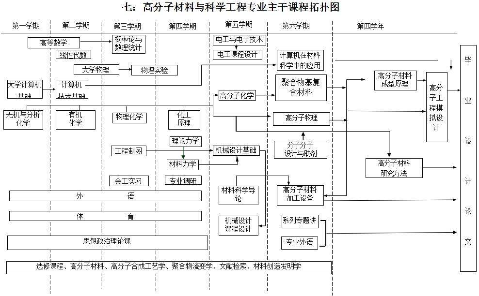 学位课:毛泽东思想和中国特色社会主义理论体系概论,体育,高等数学,无机与分析化学,物理化学,有机化学,高分子化学,高分子化学实验,高分子物理,高分子物理实验,高分子材料研究方法,高分子材料成型原理,聚合物基复合材料。