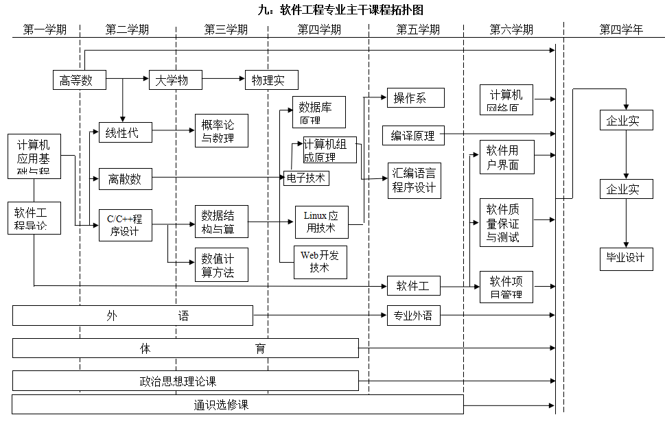 毛泽东思想和中国特色社会主义理论体系概论,外语,高等数学,计算机应用基础与程序设计,离散数学,数据结构与算法,操作系统,计算机组成原理,计算机网络原理,软件项目管理,软件质量保证与测试。